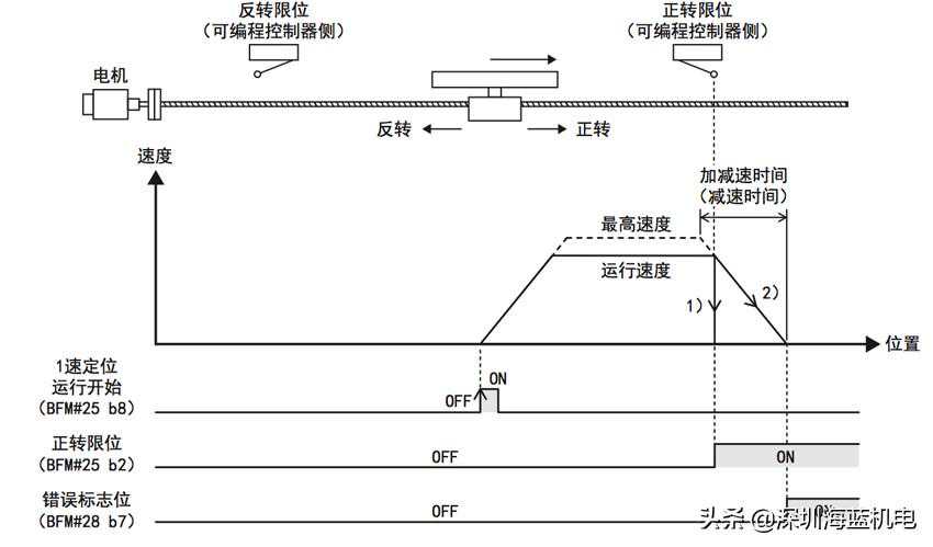 极限减速模式为OFF时的动作(下图1)运行过程中位于运行方向的正转限位/反转限位置为ON后,立即停止正转脉冲/反转脉冲,输出CLR信号。