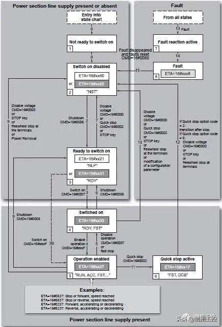 当ETA=1606使变频器进入准备好状态,此时,ETA=1607使变频器进入待运行状态,此时,ETA=160F(正转命令)或1633,变频器处于运行状态,在运行状态下,CMD写入1600可使其自由停车。