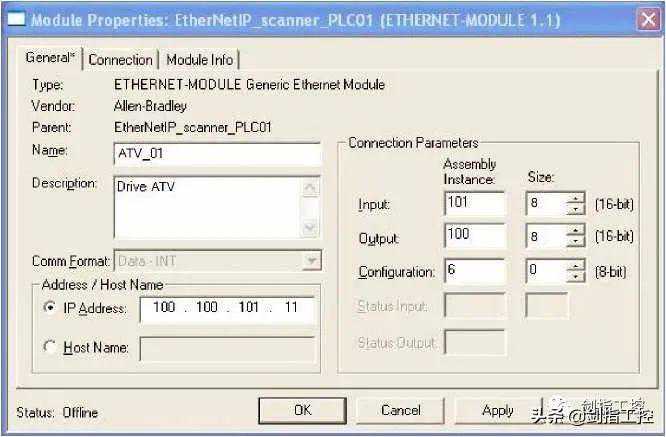 IP地址设置为变频器的IP地址,本例中为192.168.1.26,Input中的组设置为101,数量设置为8,Output中的组设置为100,数量设置为8,这两者的数量必须固定设置为8,设置为其他数值会导致PLC无法识别变频器设备;Configuration中的组设置为6,数量设置为0。