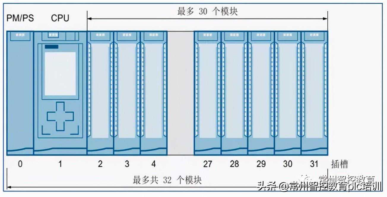 CPU拓展模块右侧最多拓展30个模块;左侧可以拓展1个PS电源模块;