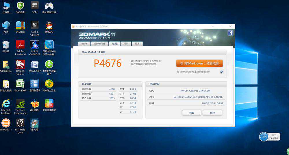 测试分别用P模式和X模式进行了两次,其中P模式分数为4676,而X分为1467。可以看出“小龙”GL62所搭载的NVIDAGeForceGTX950M中端独显还是相当给力的。