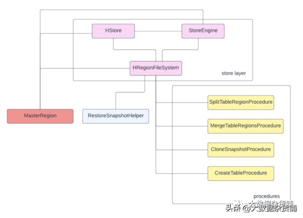 StoreFileTracking将自己的层添加到该架构中,封装文件创建和跟踪逻辑,这些逻辑以前是在存储层本身中编码的。为了帮助形象化,HBASE-26067之后的等效图可以表示为: