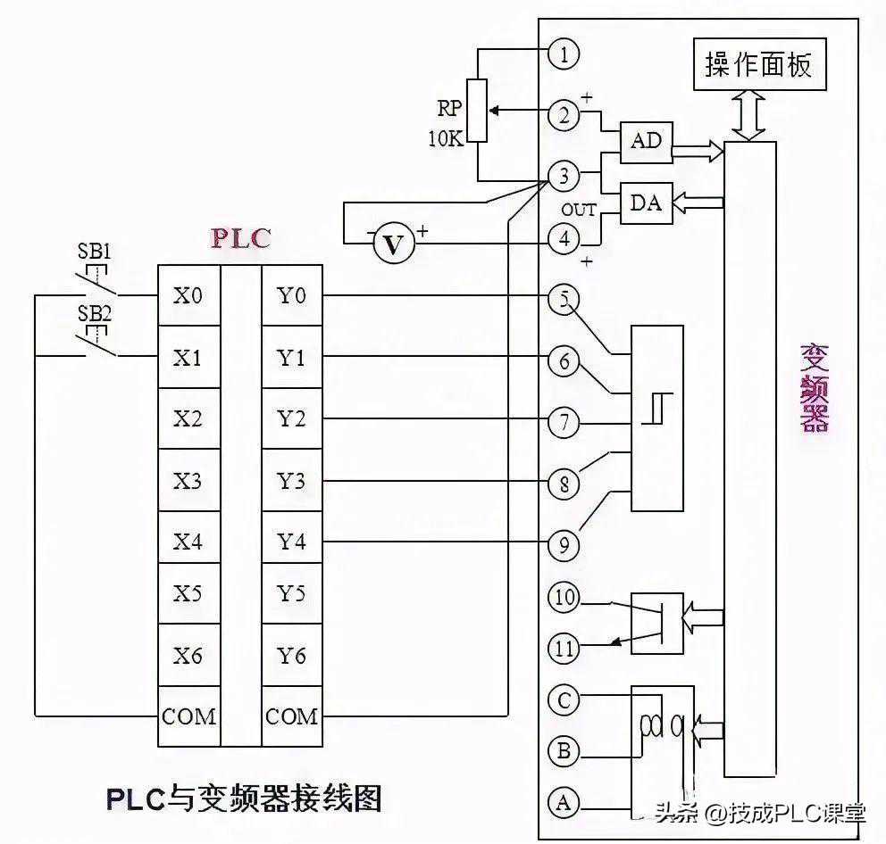 利用PLC的模拟量输出模块控制变频器PLC的模拟量输出模块输出0~5V电压信号或4~20mA电流信号,作为变频器的模拟量输入信号,控制变频器的输出频率。这种控制方式接线简单,但需要选择与变频器输入阻抗匹配的PLC输出模块,且PLC的模拟量输出模块价格较为昂贵,此外还需采取分压措施使变频器适应PLC的电压信号范围,在连接时注意将布线分开,保证主电路一侧的噪声不传至控制电路。