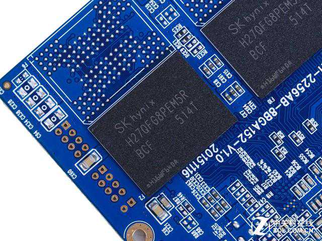 在闪存颗粒上,则选择了编号为H27QFG8PEM5R的海力士TLCNAND闪存颗粒。此款闪存颗粒,采用16nm制造工艺,分别分布在PCB正反两面,单颗容量为64GB,共4颗,标称容量256GB,除去OP冗余,还有240GB实际可用容量。