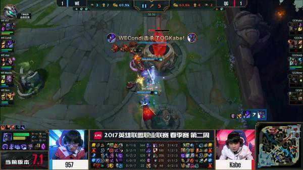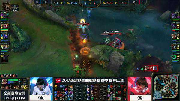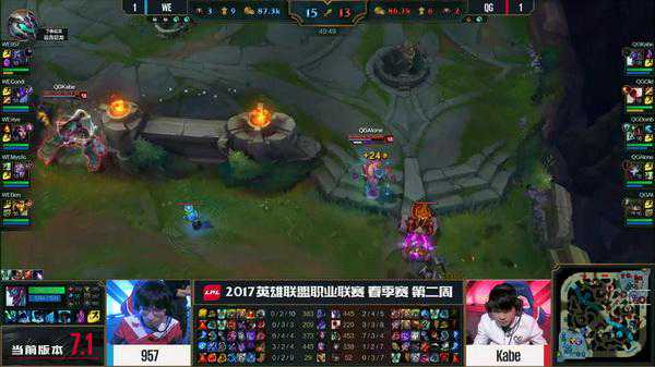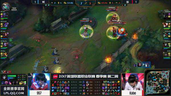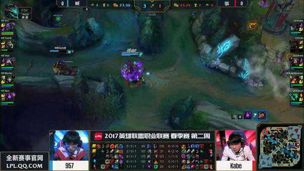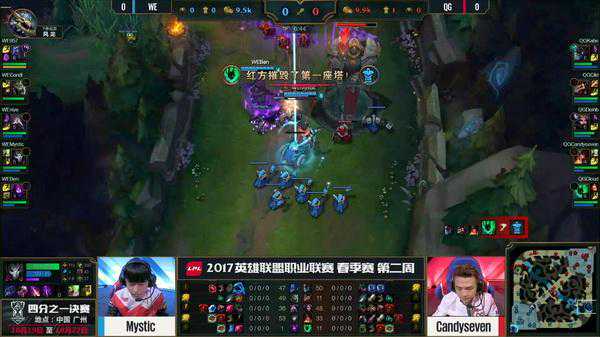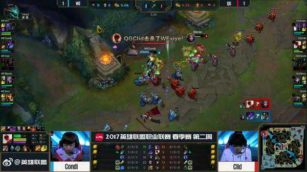 轮子妈开大想要开团,反而被中路的烬大招收掉,QG回防被留下打出了0换3,WE一波推掉了QG取得首胜。