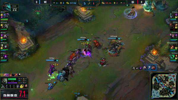 QG下路被敌方压制,QG策略换线来到上路配合男枪和大树推掉上路一塔,WE的慎传送到下路帮助推掉下路一塔,QG并没有回城反而5个人集结推掉了上路二塔。不过付出的代价是,打野和下路的等级落后了。