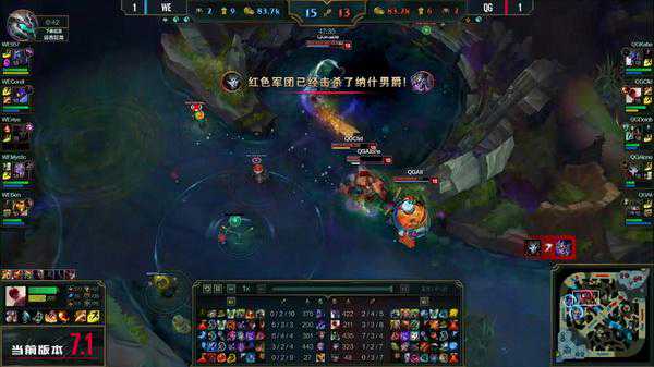 妖姬在偷掉敌方蓝BUFF后,被卡尔玛RQ雷霆直接带走,QG转战大龙,WE消耗无果。