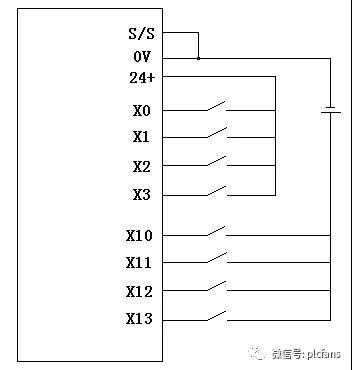 【8】在FX3UPLC的输入端口接入无源开关,XO—X3使用内置24V电源,而在X10—X13使用外置电源?应如何接线?