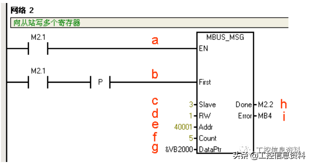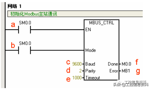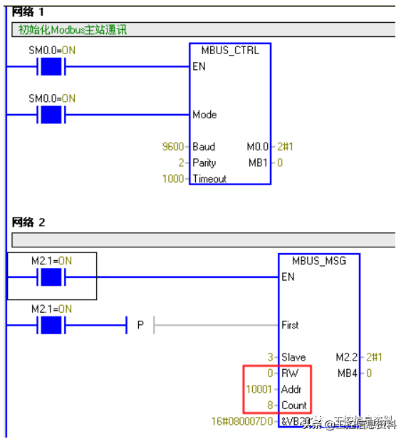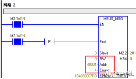 调用ModbusRTU主站读写子程序MBUS_MSG,发送一个Modbus请求。