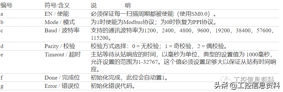 S7-200CPU上的通信口在电气上是标准的RS-485半双工串行通信口,此串行字符通信的格式:1个起始位;7/8位数据位;1位奇/偶/无校验;1停止位。通信波特率可以设置为1200、2400、4800、9600、19200、38400、57600或112500,符合这些格式的串行通讯设备可以和S7-200进行自由口通讯,ModbusRTU指令库就是使用自由口编程实现的。