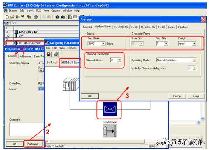 当配置好Modbus通信的参数后,保存前需要向CP341下载ModbusSlave的驱动,一旦下载完成后无需再次下载。