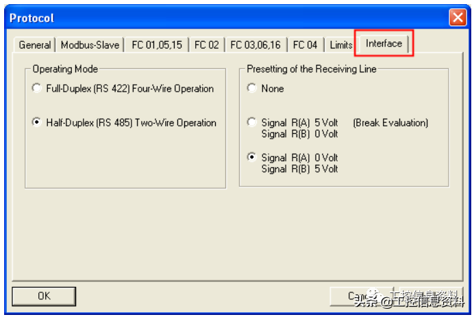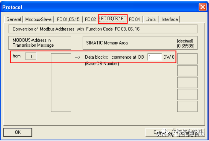 FC03/06/16对应的数据区为寄存器,数据的传递以字为单位,可以读写操作,用户地址区为4xxxx,Modbus地址在信息传递中从0开始。如上图,左边为信息传递地址,右边对应的是S7-300的数据区,左边传输地址不可改,右边只对应一个数据区。例如用户地址