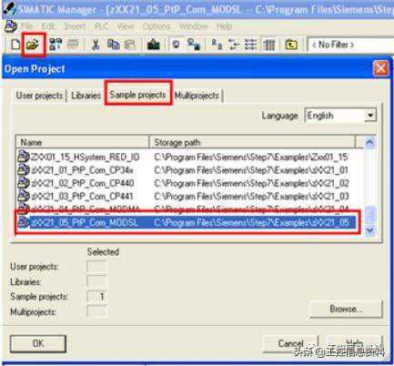 从Step7软件下的EXAMPLE目录中,找到项目名“zXX21_05_PtP_Com_MODSL”的项目,打开,然后将Modbus通讯模块FB80传递到用户项目中,打开路径如下所示。