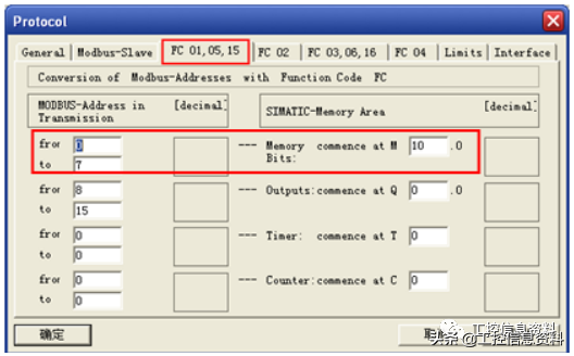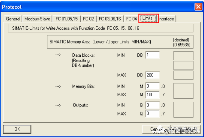 对于写功能码FC05、06、15、16,可以禁用或限制访问相关S7-300存储区,即使用这些功能码时,S7-300存储区需要在设定的最小和最大的范围之间,如果访问的区域超出这个范围,则访问会被拒绝,同时输出报错误信息。