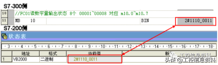 S7-200主站,用功能码FC02读取从站8点数字量输入,接收的数据存放在VB2000开始的区域,测试截图结果如下。
