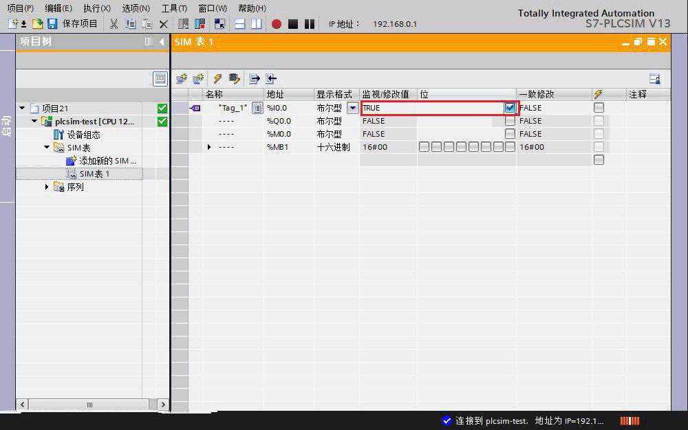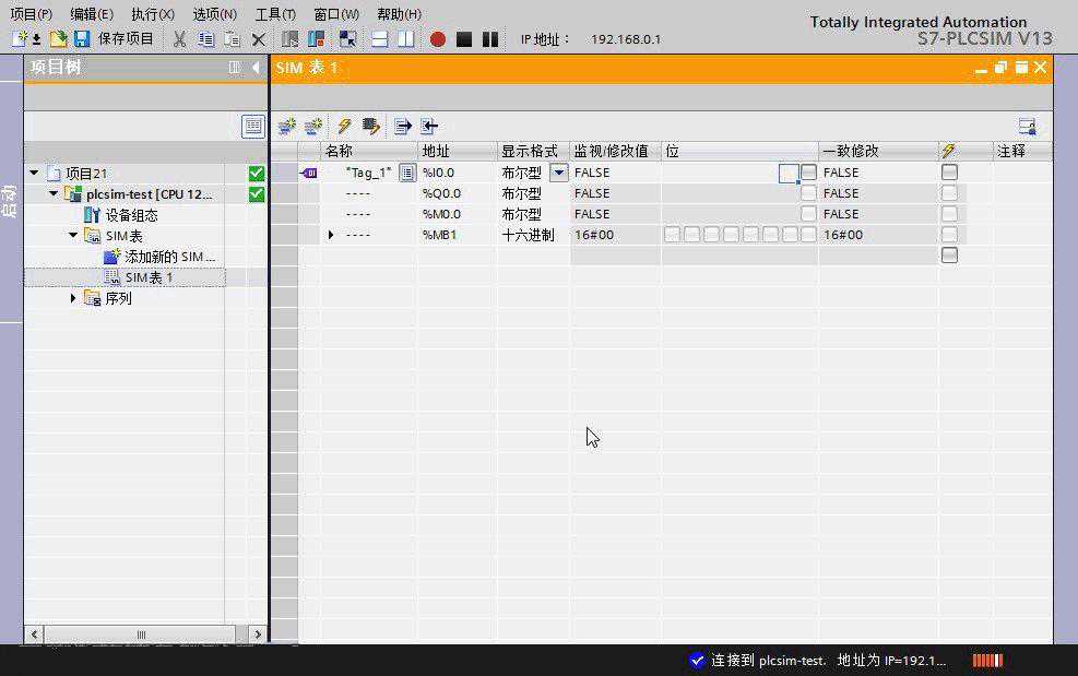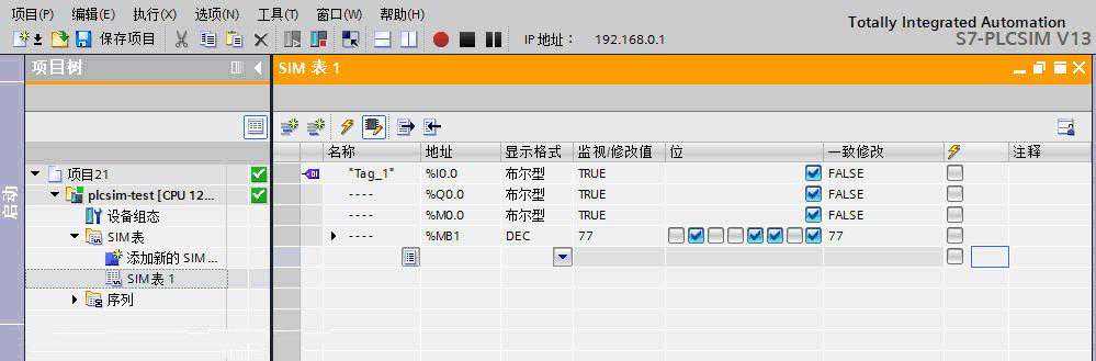 在PLCSIM左侧项目树中可以看到SIM表,用户可以添加自己的SIM表,然后在该表中添加变量,进行变量值的监控和修改。