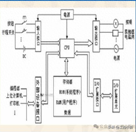 硬件系统及软件系统;硬件系统主要由CPU模块、存储器模块、I/O模块、编程器和电源组成;如图软件系统分为用户程序及系统程序;用户程序是用户为达到某种控制目的,采用PLC厂家提供的编程语言编写的程序;系统程序包括系统的管理程序、用户指令的解释程序,还包括一些供系统调用的专用标准程序块等