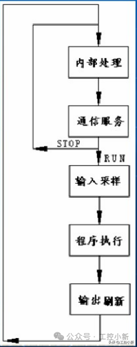一次循环主要分为5个阶段:内部处理阶段(自检)、通信服务阶段(通检)、输入处理阶段(采样)、程序执行阶段(解释)、:输出处理阶段(刷新)如图