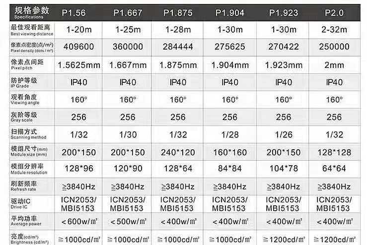 从上面这些型号可以瞬间明白了,原来led显示屏P几所指的就是产品型号,而P后面的数值所代表的就是led显示屏灯珠与灯珠之间的像素点间距离,比如室内P3,属于室内led显示屏范围,像素点间距为3mm。