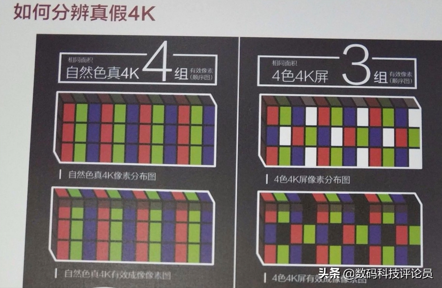另外一个就是对着电视屏幕拍一张照片,将照片放大看,红绿蓝三种颜色排列整齐就是真4K,如果是4种颜色则是假4K。