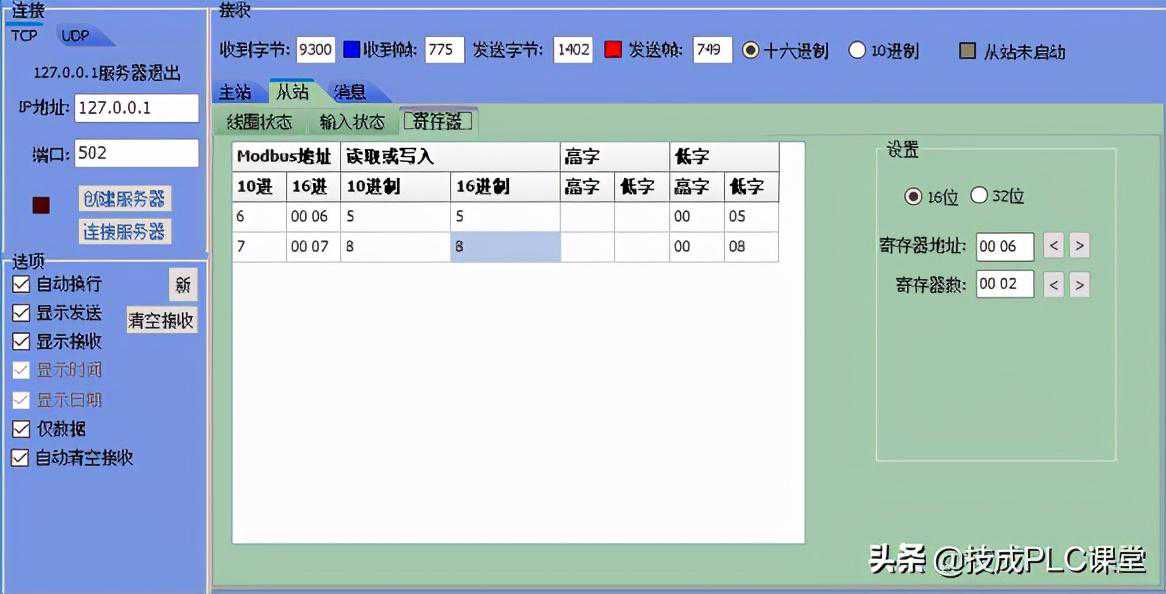 WHILEPROC在MODBUDS调试工具中设置好IP地址和端口号(127.0.0.1和502),地址0006和0007这两个地址的值,分别手动赋值是5和8。