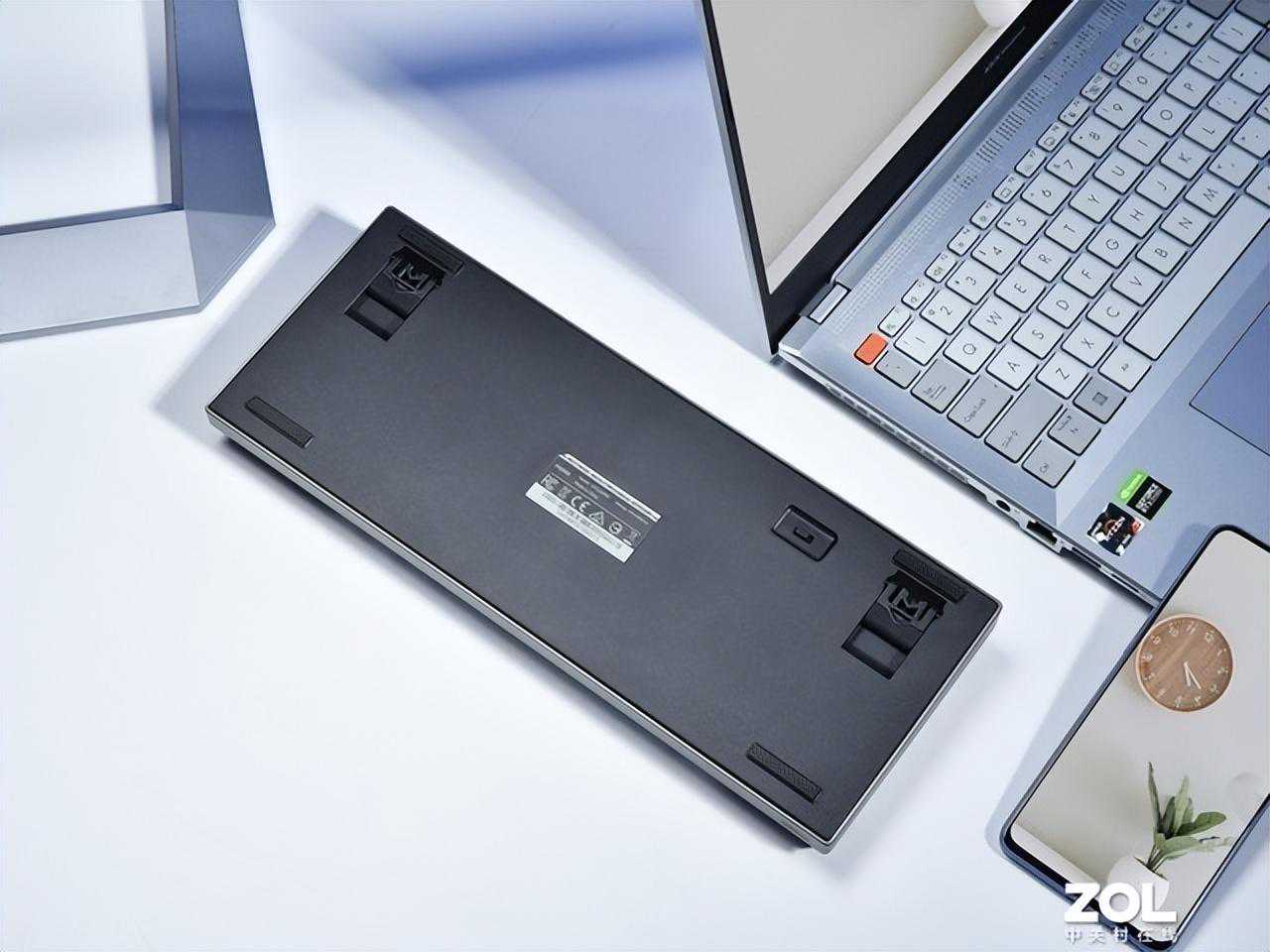 键盘的底盖上拥有一枚电源开关。这把键盘支持蓝牙3.0、5.0、无线2.4G和USB模式连接,支持5台设备切换使用,这样的特性对于主要用途为办公的键盘来讲还是非常够用的,可以提升我们的办公效率。