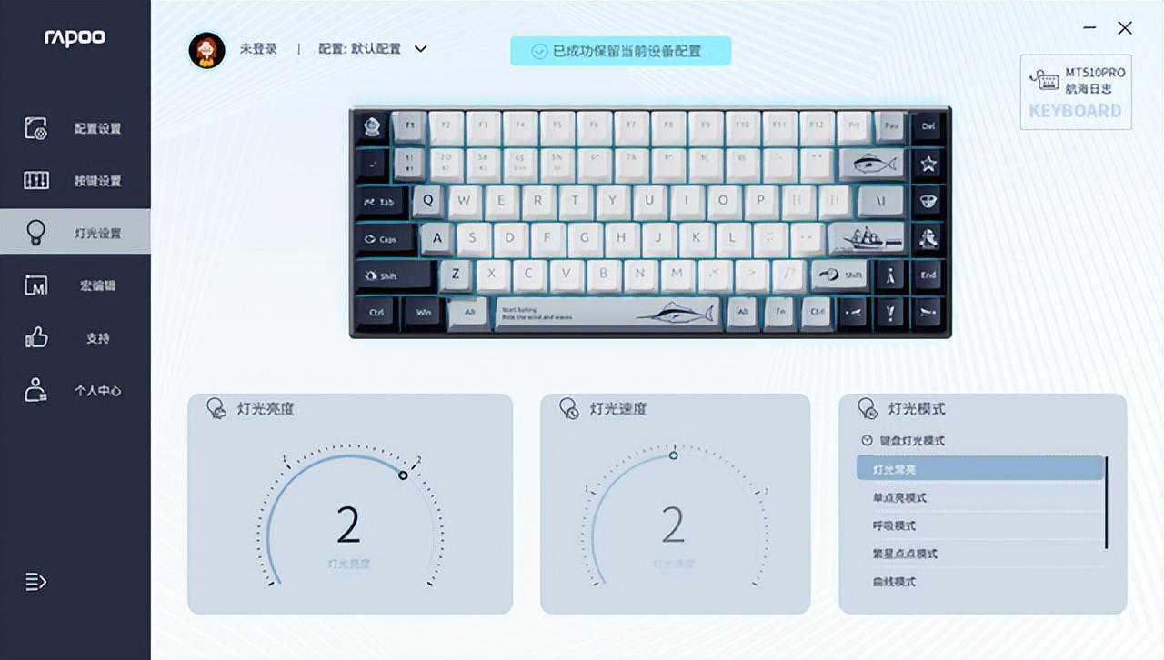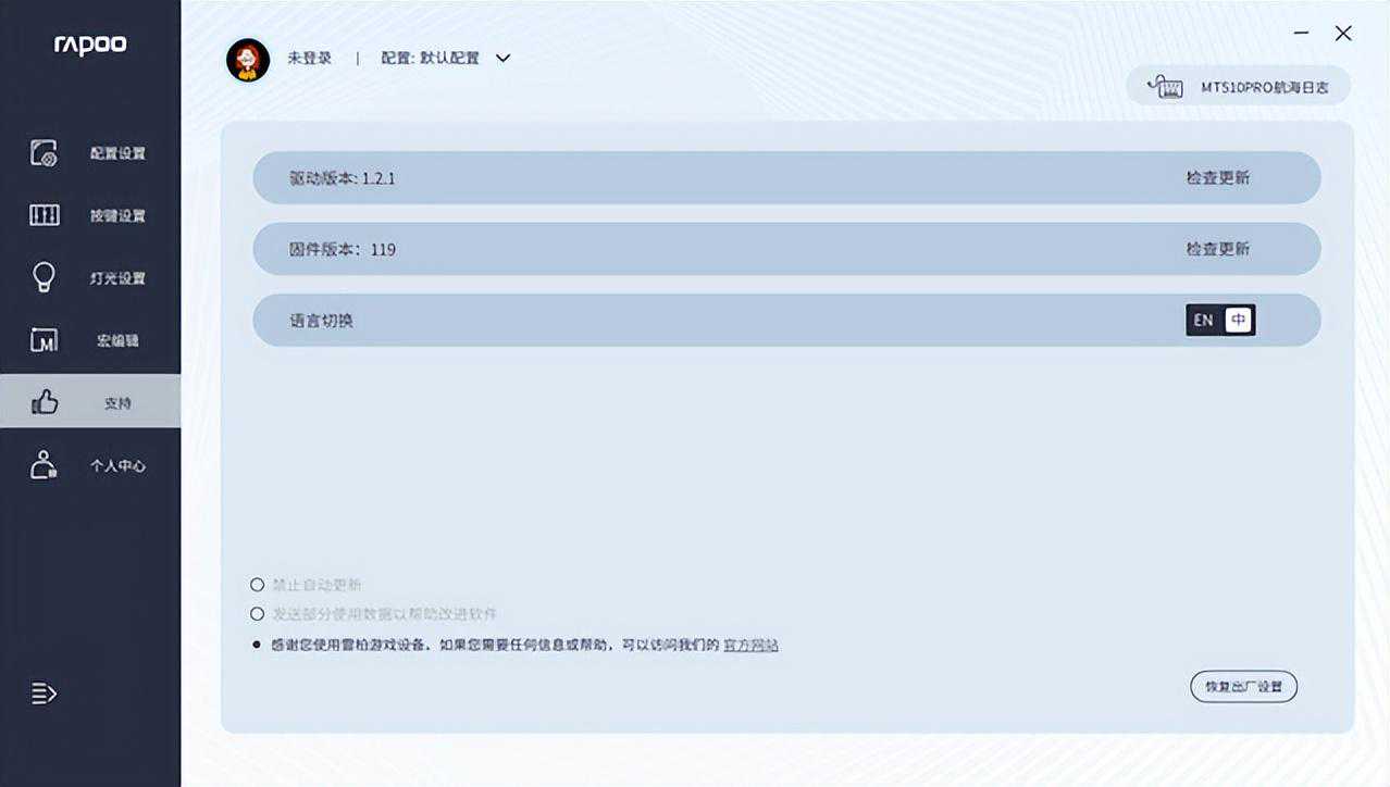 雷柏MT510PRO多模机械键盘配备了完备的驱动,键盘支持通过驱动调节背光并进行按键宏编辑,并且还支持云存储,云共享,跟上了时代的潮流。想要使用它的驱动,就需要在有线模式下来调节,这一点还是需要注意的。另外,雷柏为键盘的两款不同配色都适配了驱动皮肤,在下载的时候我们可以按照键盘的配色来寻找对应版本。