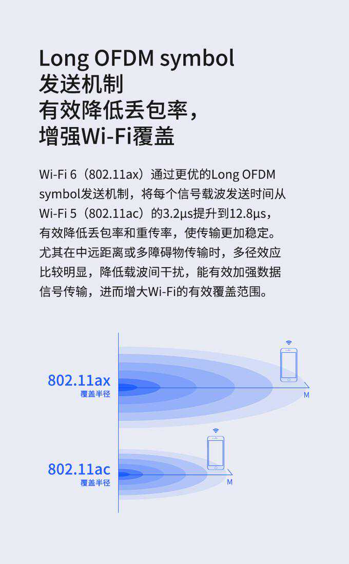 除了1200mbps的速率比866mbps速率更高,Wi-Fi6的提升还在正交频分多址(OFDMA)、BSS染色、TWT对齐唤醒、LongOFDM大包长间隔这几项新特性。对于Wi-Fi6的优点,显然路由器厂商比小编更专业,并且它们为了营销也会把所有优点,尽可能详尽的介绍出来,在这里小编就不重复造轮子了。