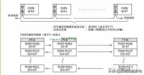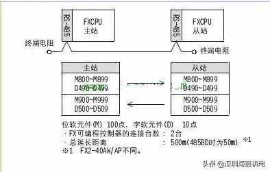 用FX2N,FX2NC,FX1N,FX和FX2C可编程控制器进行数据传输时,是采用100个辅助继电器和10个数据寄存在1:1的基础上来完成。FXlS和FXON的数据传输是采用50个辅助继电器和10个数据寄存器进行的。