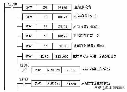 数据寄存器D8176设置站点号,0为主站点,1到7为从站点号D8177设定从站点的总数,设定值1为1个从站点,2为两个从站点;D8178设定刷新范围,0为模式0(默认值),1为模式1,2为模式2;D8179主站设定通讯重试次数,设定值为0到10;D8180设定主站点和从站点间的通讯驻留时间,设定值为5到255,对应时间为50到2550ms