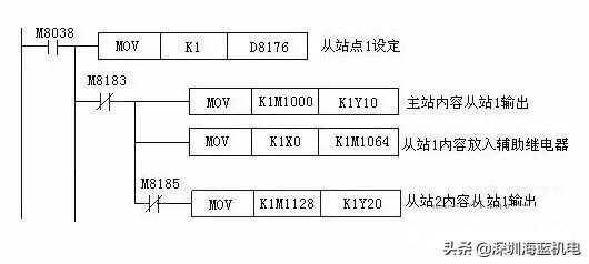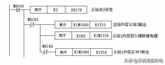 ②从站点1的输入点X0到X3输出到主站和从站点2的输出点Y14到Y17。