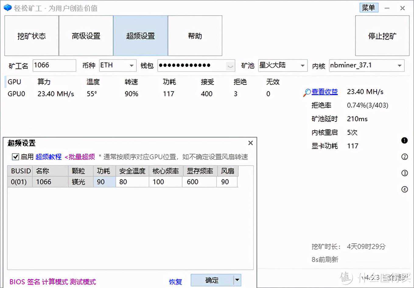 魔龙拉满后,算力也是48M左右,温度不到60°,功耗220多W。1080ti系里的高端卡大多数都保持在满载47M左右的算力,显存颗粒也都是清一色的镁光,个别是三星,海力士那种垃圾不配出现。凡是海力士显存的卡,玩游戏还行,挖矿千万别买。