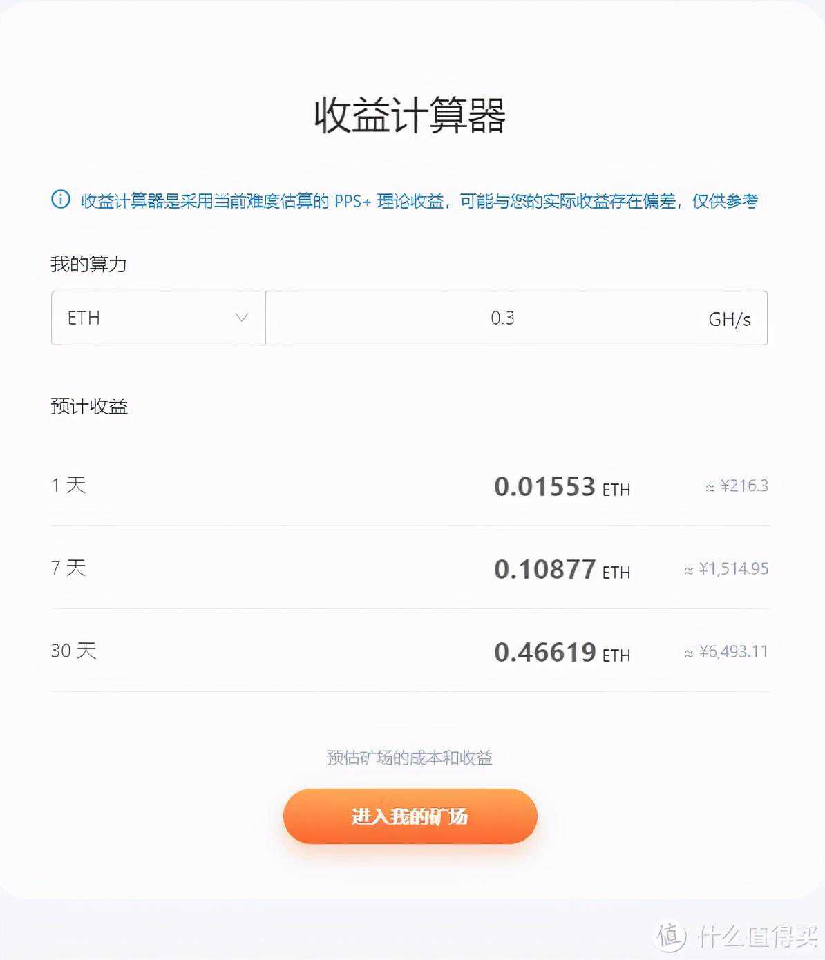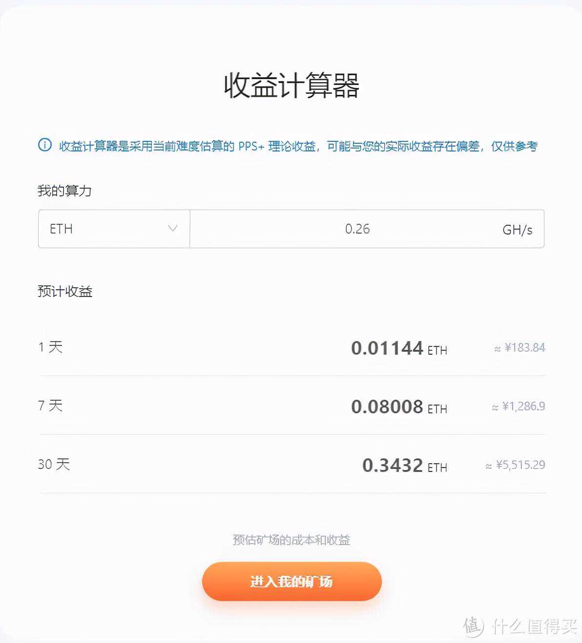 按目前的算力计算收益,每天能挖0.01个ETH,10天挖到0.1个提币。日收益183块,周收益1286,月收益5515。耗电量在1200W,按商电计算,一个月要销号860多度,电费在600多块。