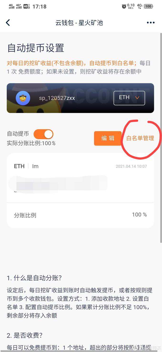 地址里填中间钱包imToken的地址,外面分账比例设置100%,这样当矿池挖满0.1个ETH达到最低自动提币阈值,就会在每天3点以后自动向白名单内的中间钱包地址转币。