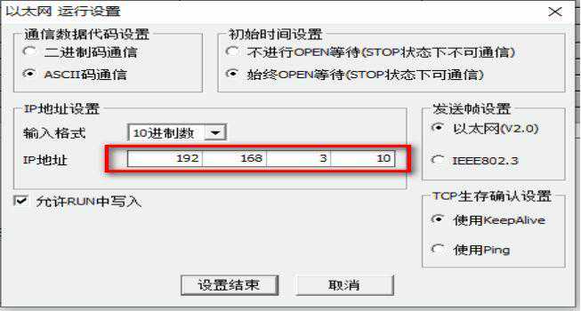 3.双击“运行设置”,进入以太网运行设置界面,根据下图所示,设置IP地址。完成后点“设置结束”完成设置。