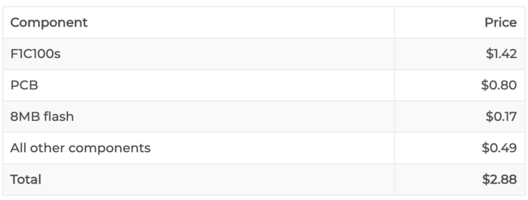 处理器的选择是最重要的部分,它会控制成本并确定整个项目是可行的。在一系列调研后,George选择了F1C100s,它是Allwinner出品的一块贼便宜的芯片,它在成本优化上下足了功夫。这块芯片集成了RAM与CPU,在功能上至少已经满足要求了。