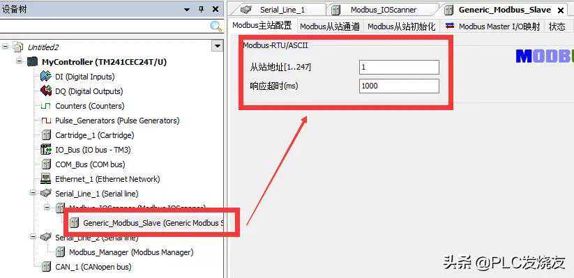 第六步:双击GenericModbusSlave,进入Modbus主站配置,确认从站地址、响应超时时间。