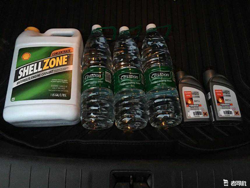 接下来整备防冻液和刹车系统,买的壳牌(SHELL)无水,-60℃~129℃,加上纯净水1:1比兑,够了。最后实际是用蒸馏水掺的,加进去5L多。刹车油是菲罗多(FERODO)DOT4,原车建议DOT3,通用,就来4吧。