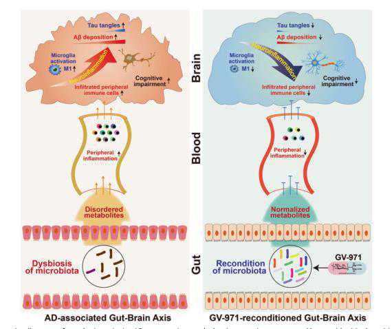 AD进程中“肠脑轴”调节示意图及GV-971干预策略。