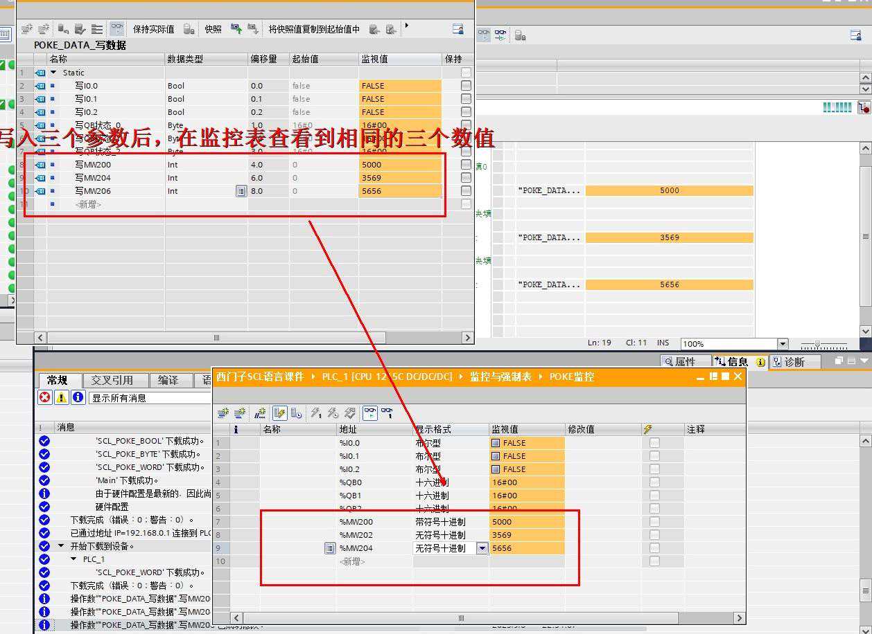 分别对DB31..DBW4,,的值修改,观察监控表里的%MW200,%MW204,%MW206,值分别是5000,3569,5656,因此这个结果是正确的。