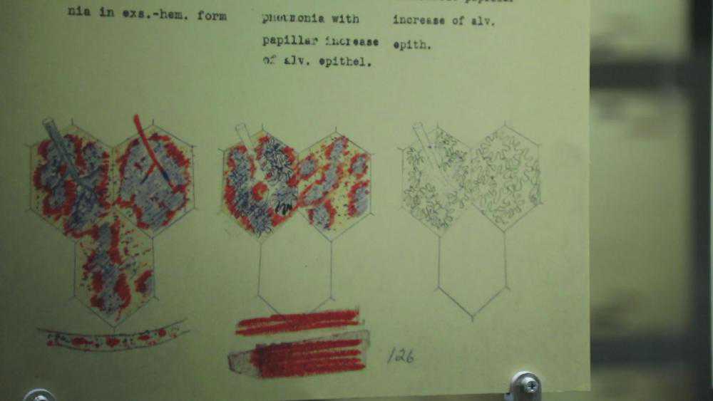 美国解密的七三一部队人体实验报告书——A报告的内页影印件,本页是人体器官甲状腺感染炭疽菌图(侵华日军第七三一部队罪证陈列馆提供)