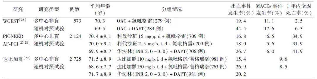WOEST研究[26]发现,OAC和氯吡格雷的双联治疗对比TT有较低的出血风险(19.4%比44.4%)及全因死亡率(19.4%比44.4%),根据不同的出血评价标准对比来看:TIMI评分:主要出血风险:3.2%比5.6%,小出血、轻微出血:14%比31.3%;GUSTO评分:严重或威胁生命的出血:1.4%比3.5%,中度或轻微出血:5.4%比12.3%;BARC评分:3级:6.5%比12.7%,2级:8.2%比20.8%,1级:6.5%比15.8%;输血事件发生率:3.9%比9.5%,而心肌梗死、卒中、靶血管重建、支架内再狭窄的发生率大致相同。PIONEERAF-PI研究[27-28]对比了利伐沙班大小剂量与华法林在房颤PCI支架置入术后患者的抗栓治疗中的综合疗效,发现利伐沙班有较大的临床获益。一项多中心试验研究对比了TT、两种不同剂量的达比加群分别合并一种P2Y12抑制剂的三种治疗方案之间的出血风险及相对疗效,结果显示,较之110mg和150mg达比加群组,TT组的主要出血风险有所升高,但在疗效及严重血栓不良事件发生率之间,三组并无显著差异[29](表1)。