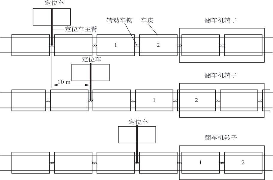 秦皇岛港煤二期翻车机卸车工艺为:由定位车的主臂(正常情况)或辅臂(翻车机转子外重车少于或等于3节时使用辅臂)将翻车机转子左侧重车牵入翻车机,每循环牵入翻车机车皮2节(正常情况下)或1节(尾车剩1节时),牵入后翻车机自动卸车,然后自动执行下一循环。由于不再添加其他检测限位和检测装置,只能重新审视接卸工艺,根据现有接卸工艺的特点设计翻车机重车空车识别程序,当系统中现有的进车检测程序检测到车皮后,此时车皮即在接卸区域内,如图1所示,定位车伸出主臂(辅臂)扣钩后即可牵引重车,当定位车向前行走,即将重车牵引入翻车机转子内。据此,可以认为车皮在接卸区域内时,定位车主臂(辅臂)伸出向前行走一定距离后翻车机转子内即为重车。由于C80、C76单节车皮长度都大于10m,于是把这个距离设定为10m,即当定位车主臂(辅臂)伸出向前行走内监视屏上即显示翻车机内为重车,此时判定重车程序自锁,只有翻车机倾翻至最大角度才解除锁定,解锁后监视屏上显示翻车机内为空车。同时,在自动作业程序中添加限制条件,当自动作业中定位车牵入2节或1节车后,终止自动循环中下一循环开始程序,当为空车后,方可进入下一循环,开始继续迁入重车。