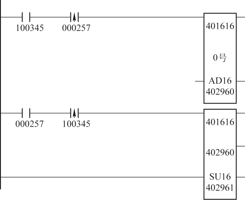 当定位车主臂伸出时,在定位车行走启动瞬间将定位车的位置数据写入寄存器402960。如图3所示,100345为定位车主臂伸出扣钩检测限位,寄存器401616内的数值为定位车位置数据,利用AD16(16进制加法)模块将定位车启动瞬间的位置数据写入寄存器402960,之后,在主臂伸出行走过程中计算定位车行走距离,即将寄存器401616中的数值减去寄存器402960的数值,并将计算的差值存入寄存器402961中。