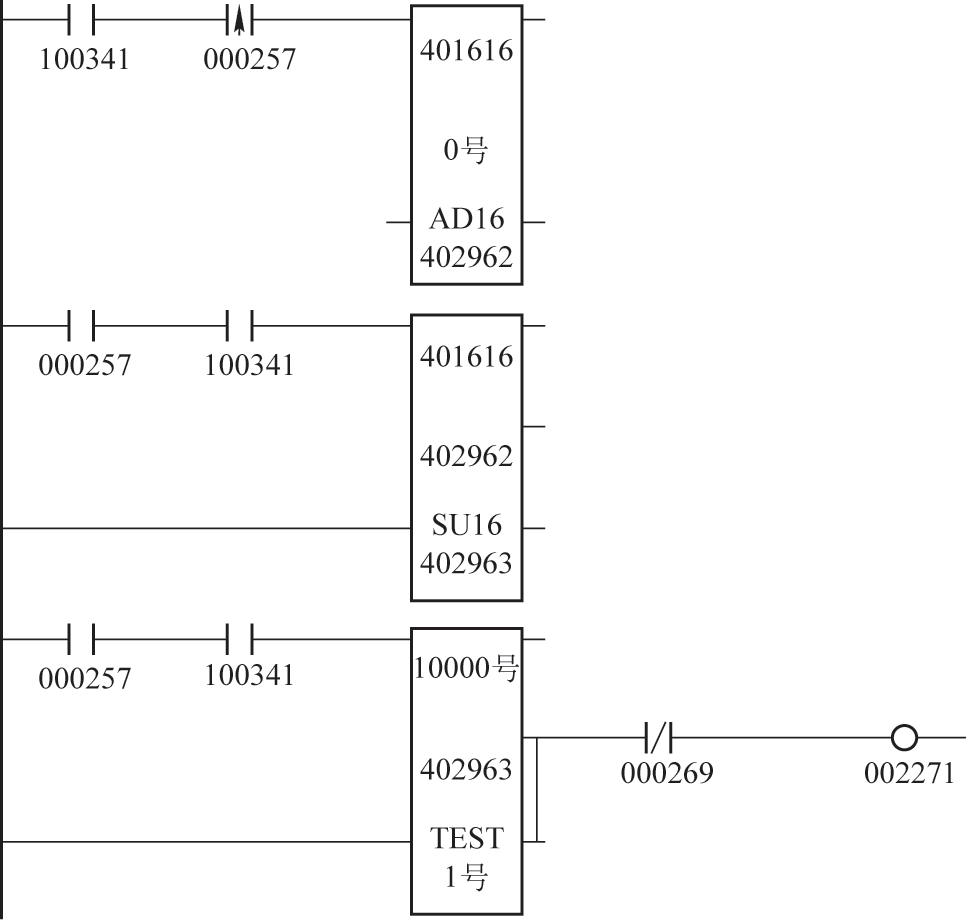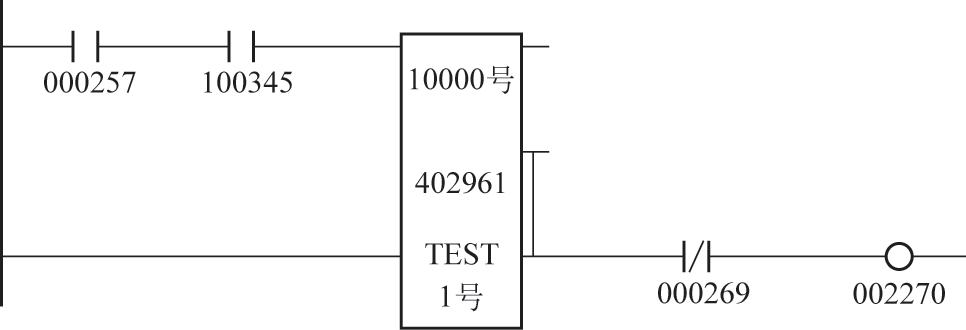 当寄存器402961中的数值≥10000时,即定位车行走距离≥10m时,向系统输出行走距离达到10m判定信号,如图4所示,TEST模块为数值比较运算模块,其比较寄存器402961中的数值,当寄存器402961中的数值≥10000时,下面两根输出线输出信号,000269是定位车反向行走信号点,反向行走时不输出判定信号,判定输出信号使用002270作为标志位。