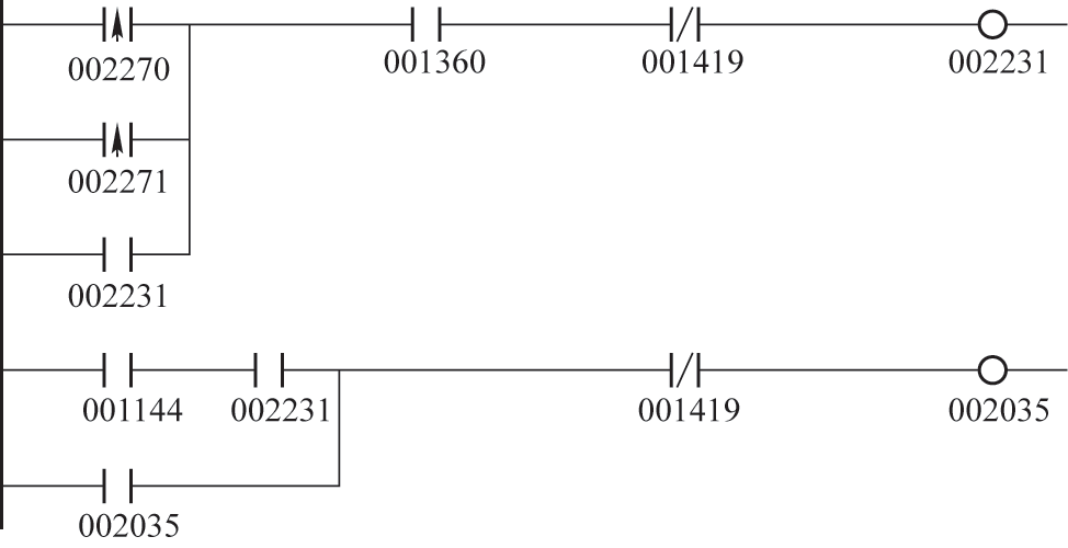 如图6所示,上半部分是判断翻车机转子内是重车还是空车程序,001360为1时表示车皮在接卸区域内,001419为1时表示翻车机倾翻到最大角度,其输出的002231既是下部分的循环自动启动禁止信号的触发信号,又是上位监控画面的空重车提示信号。