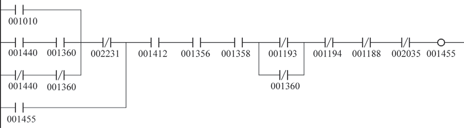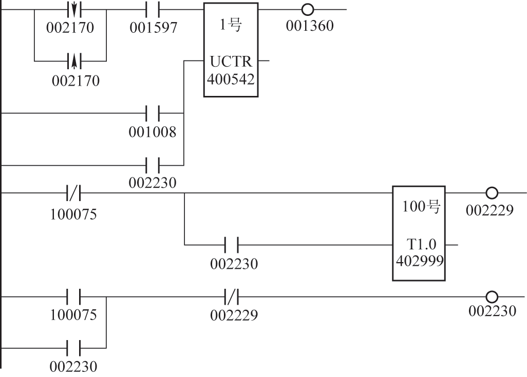 如图8所示,在原有程序的基础上添加了002230点,使表示车皮在接卸区域内状态的001360信号不受手动操作影响,图中点001008为手动操作状态点,点100075为出口西侧空车车皮检测信号,当出口有空车时,由于是不解列作业,即认为车皮在接卸区域内,手动不会复位001360,且考虑车皮间钩裆会引起点100075中断,因此还添加了延时断程序,延时10s断开002230点,避开车皮运动时002230点断开使手动作业时001360复位。
