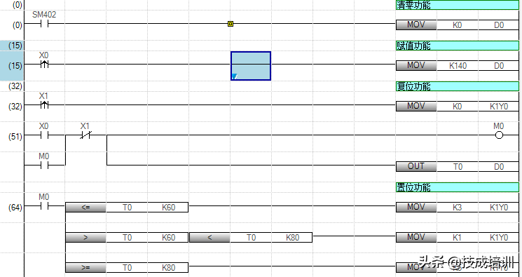 程序首先是上电一个扫描周期利用传送指令做清零功能,当按下启动按钮时做定时器设定值的赋值功能,当按下停止按钮时做输出Y点的复位功能。中间的启保停程序当启动按钮X0接通时,M0接通并通过M0常开自锁,同时驱动定时器T0进行延时,设定值便是前面传送到D0的K140,后面通过触点比较指令比较时间范围并进行输出即可,当T0=K60时,即6s时间内,传送K3到K1Y0,二进制状态为0011,那么Y0和Y1接通,也就是说主接触器和星型接触器接通,当K60=T0K80时,即6s~8s时间范围内,传送K1到K1Y0,二进制状态为0001,那么只有主接触器Y0接通,当T0=K80时,即8秒之后,传送K5到K1Y0,二进制状态为0101,那么变成主接触器Y0和三角型接触器Y2接通,从而实现了星三角转换的降压启动。