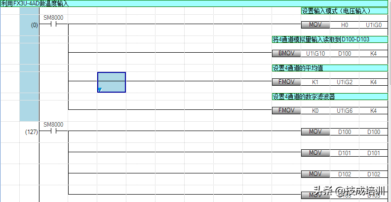 BMOVU1\G10D100K4是将4个通道的模拟量输入读取到D100~D103寄存器中。FMOVK1U1\G2K4是设置4个通道的平均值,K1是初始值,代表没有平均的效果,可以更改平均值的数值为K2~K4095即启用了平均值功能,FMOVK0U1\G6K4,K0是初始值,代表关闭滤波器功能,更改为K1~K1600即开启滤波器,注意平均值功能和滤波功能任选其一使用。