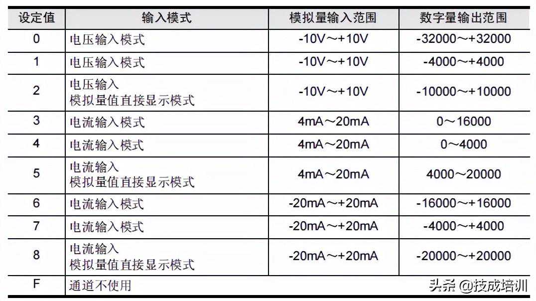 根据FX3U4AD模拟量模块手册,并查找输入模式设置规定,通过指令MOVH0U1\G0,U1代表是扩展模块的位置编号是1,G0指的是模块的输入模式地址为BFM#0,H0代表4个通道都设置为-10~10V的电压输入模式,数字量输出范围是-32000~32000。